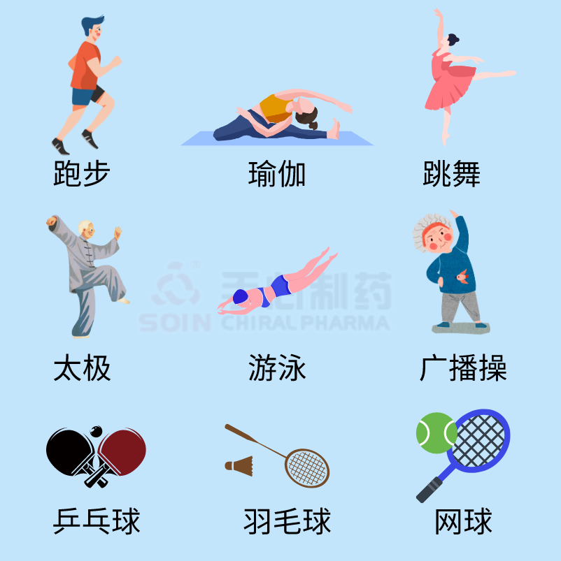 有氧运动如:快走、跑步、骑自行车、跳绳、广播操、游泳、瑜伽、舞蹈、健美操、广场舞、太极拳(剑)、乒乓球、羽毛球等。